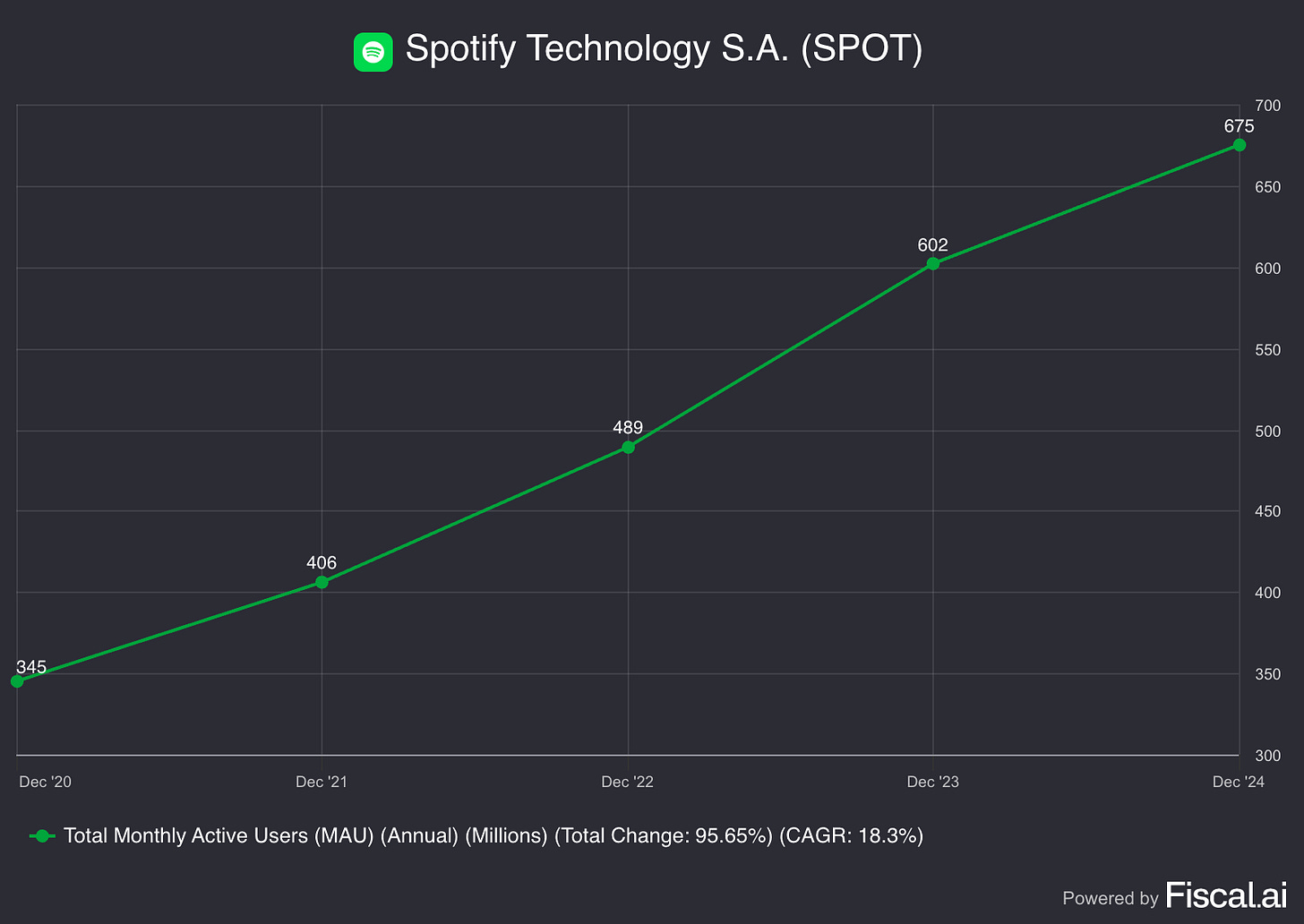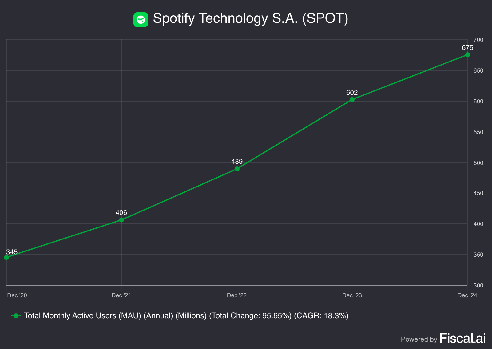 As of Q4 2024, Spotify had 675 million monthly active users of which 236 million pay. The unit economics are improving quickly too, with a 30% surge in ad-supported revenue and higher subscription pricing.