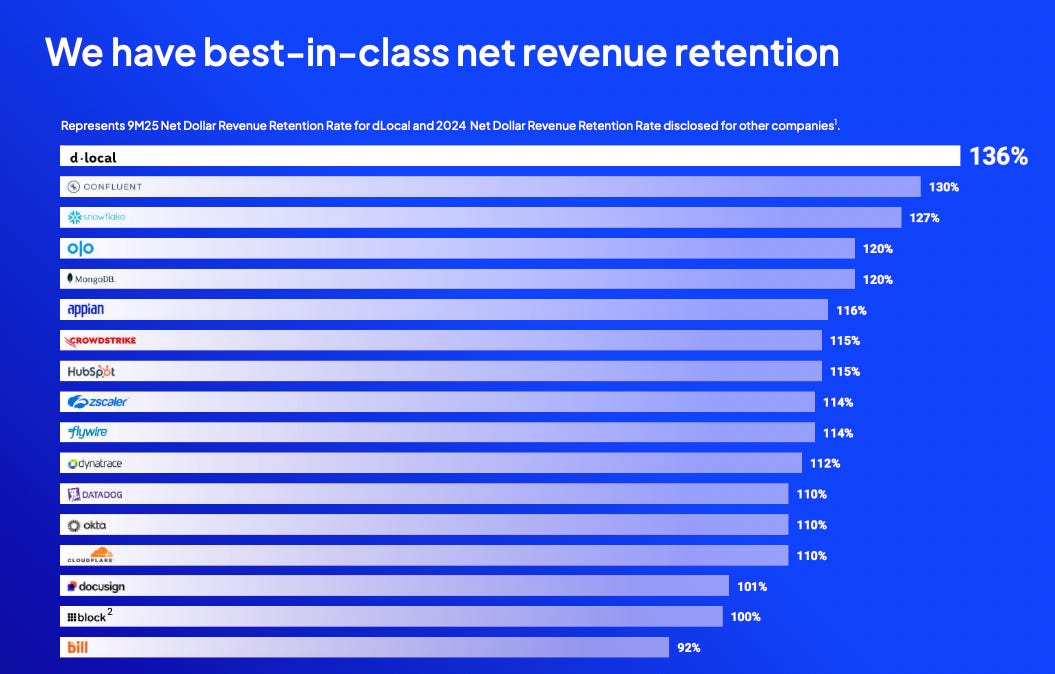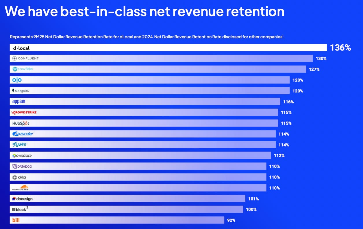 NRR cuts through the noise of take rates and measures whether existing merchants are deepening their engagement with dLocal. A high NRR as we see in this case (149%) is representative of the fact that merchants are processing more payment flows and increasing their reliance on dLocal.