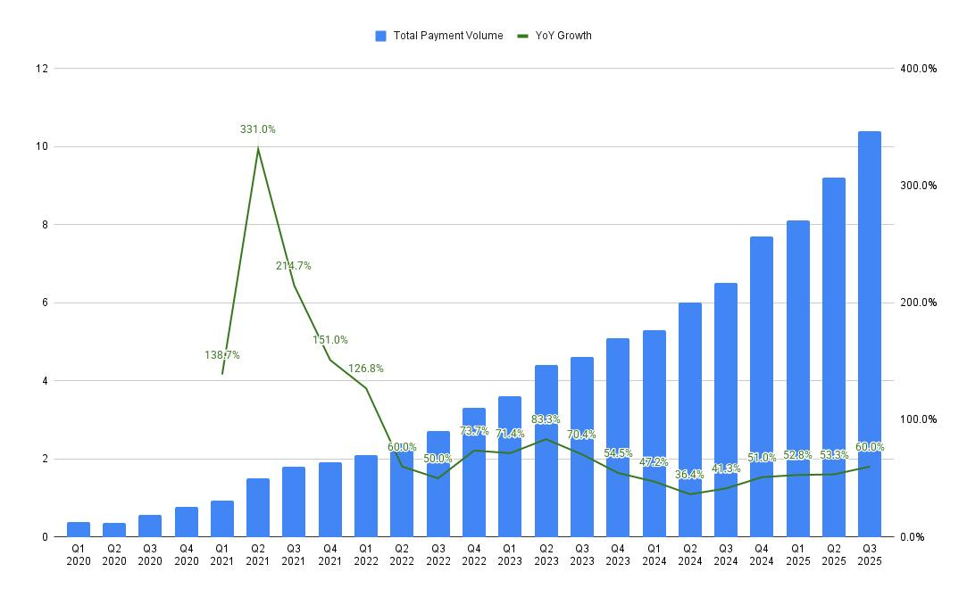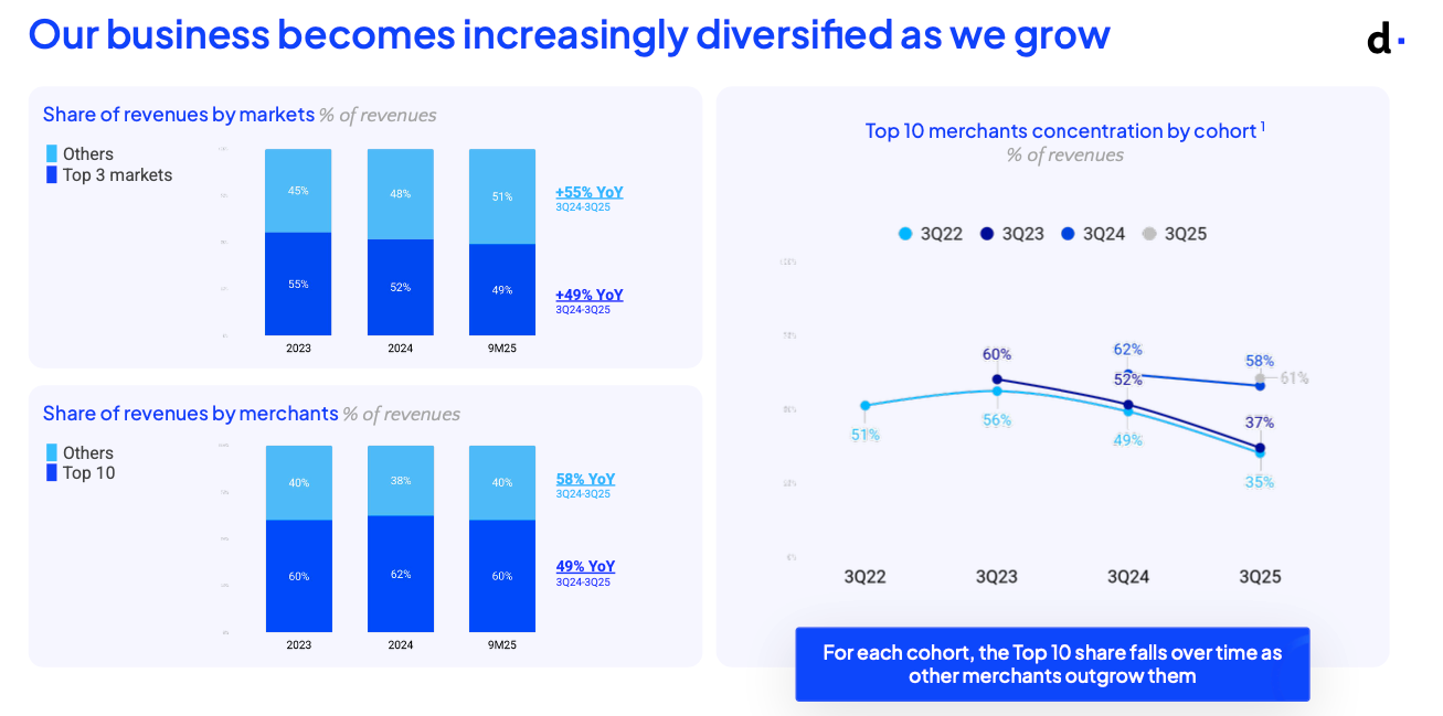 A similar pattern is visible on the merchant side. The top ten merchants accounted for about 60% of revenue in 9M25, in line with prior years but trending slightly lower compared with 2024. However, as discussed during the call, the top 10 merchants are constantly changing, as others outside the top 10 grow quickly to enter the group.