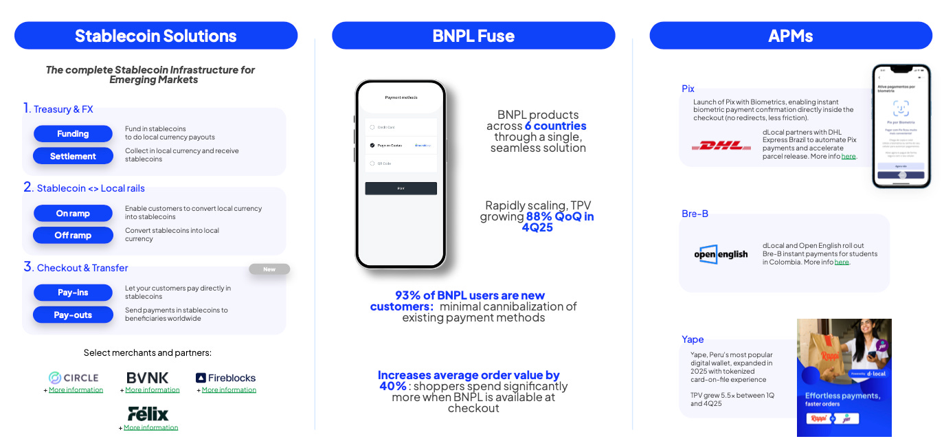 It also announced BNPL Fuse which is now operational in 6 countries and scaling rapidly, with dLocal reporting 88% QoQ growth in 4Q25. Importantly, 93% of BNPL users are new customers, which means little to no cannibalisation of existing payment methods.