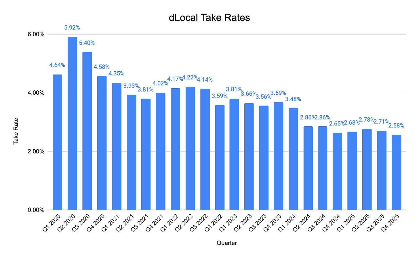 Gross take rates for the quarter were 2.58%, a 13bp decrease QoQ and 7bp decrease YoY.