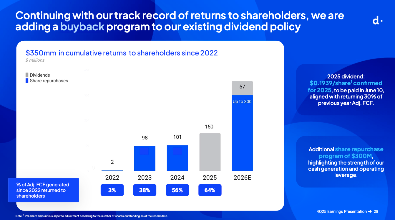 dLocal also announced a $300M buyback plan supplementing the previous dividend plan that was shared. Last year, dLocal announced that 30% of the previous year’s Adj. FCF will be returned to shareholders.