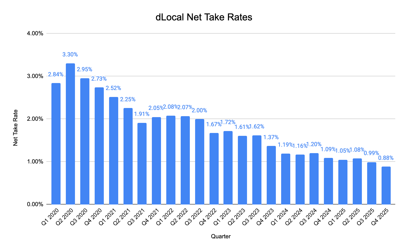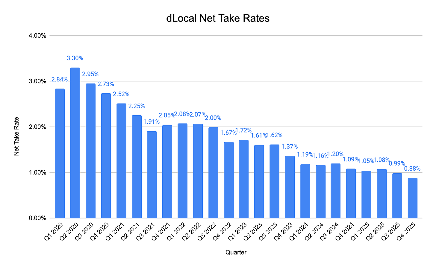 Net take rates came down yet again this quarter, falling to 0.88%, an all-time low.