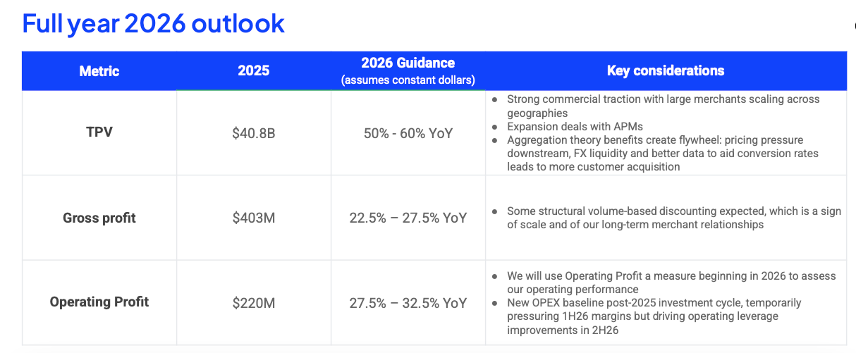 Gross Profit growth is slightly light, at just 25% at the midpoint. This is compared to 36.7% in 2025. Management noted that this is due to dLocal’s scale and long-term merchant relationships that will inevitably lead to more favourable terms for merchants.