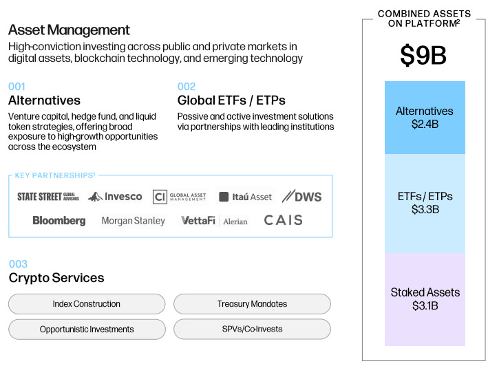 As of Q2 2025, Galaxy holds over $9B in combined assets split across alternatives, ETFs/ETPs and staked assets and is among the largest crypto asset managers globally alongside Grayscale and Bitwise.