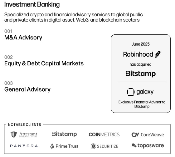On the investment banking front, Galaxy has attempted to position itself as the “Goldman Sachs of Crypto”. It provides M&A advisory to crypto and blockchain companies, runs capital market advisory, helping digital asset firms raise equity, debt or token-based financing.