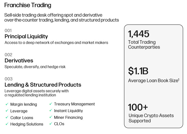 On the trading and brokerage front, Galaxy acts as a principal trader across spot crypto, derivatives, and structured products. It runs market-making for institutional clients, offers liquidity across multiple tokens and exchanges, and facilitates lending & financial solutions for clients.