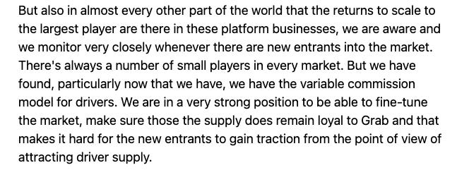 Mobility and Deliveries are platform businesses where the majority of value accrues to the winner. (See $AMZN with e-commerce, $GOOGL with search, $META with social, $UBER with ride-hailing.) GRAB 0.00%↑ is on a clear path towards that, and this was reiterated during the Q3 earnings call.