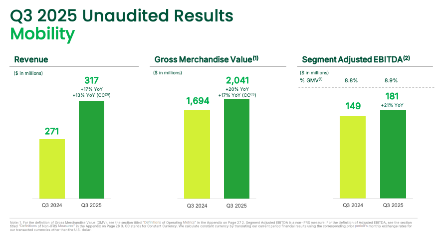 Mobility GMV grew only 13% despite transactions growing 30%. This shows the push for affordability is working, but also implies much lower average order value and price pressure.