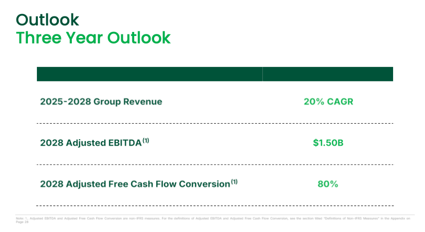 They guided for 20% revenue CAGR over the next 3 years and a 200% increase in Adj. EBITDA, along with an increase in Adj. FCF conversion from 52% in 2024, 56% in 2025 to 80% in 2028.