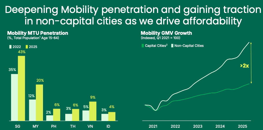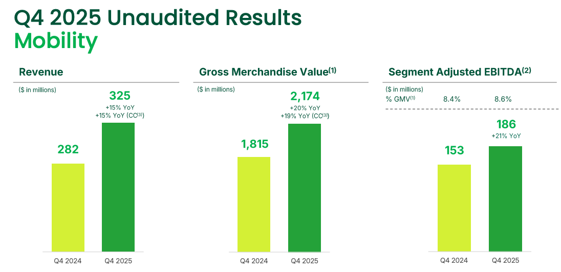 Mobility GMV grew 19% YoY on a constant currency basis. However, revenue growth was lower at just 15% YoY due to the focus on affordability.