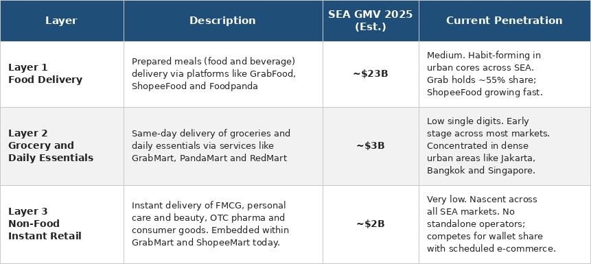 The defining structural insight about quick commerce in Southeast Asia is that it is not a single market with a single competitive dynamic. Instead, it is three distinct demand pools, each at a different stage of maturity, different unit economics and each requiring a different set of merchant and infrastructure capabilities.