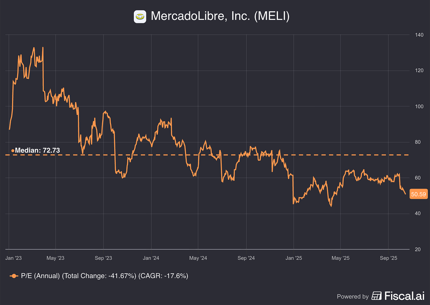 MELI currently trades at a 50x PE ratio with median analysts estimates for FY2026 EPS growth at 46.3%.