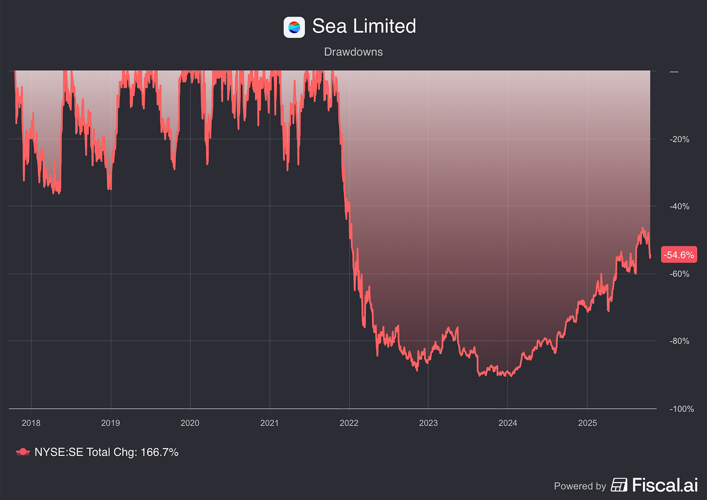 Yet, these businesses have not been without its drawdowns. Sea Limited has seen 5 drawdowns larger than 25% in the past 7 years, including a 90% drawdown that it has yet to recover from.