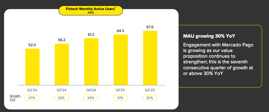 Mercado Pago’s total payment volume (TPV) rose 39% YoY in USD terms to $64.6B, with acquiring TPV (on and off platform payments) hitting $44.4B, up 31% YoY.