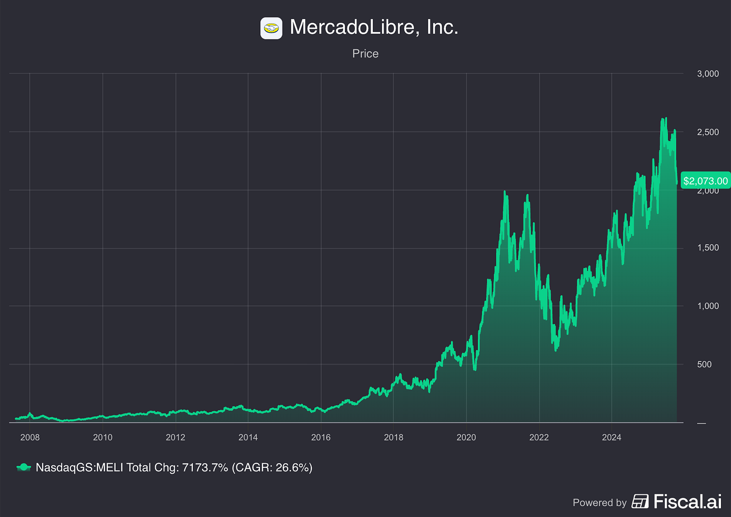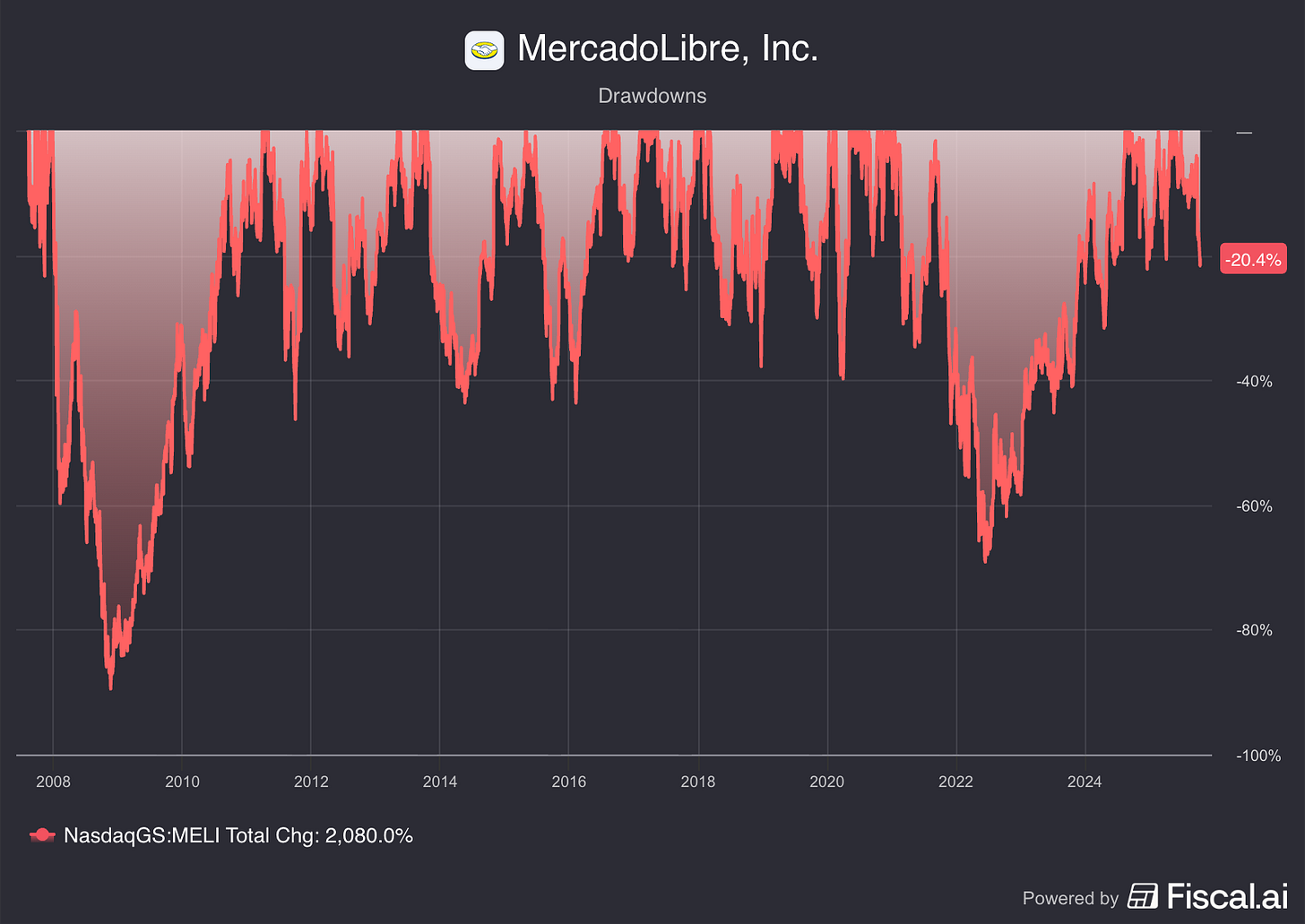 Mercado Libre has seen >30% drawdowns 9 times over the last 17 years.