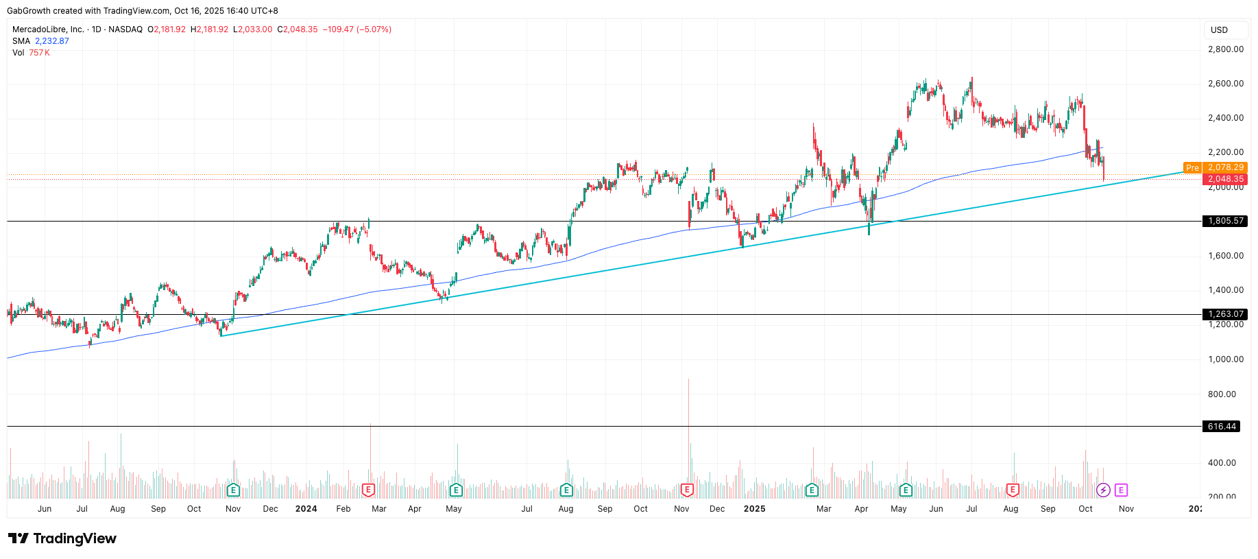 MELI has been on a downtrend over the past 3 months starting from a large intraday sell off on 1st July, coincidentally the day the stock set a new all-time high.