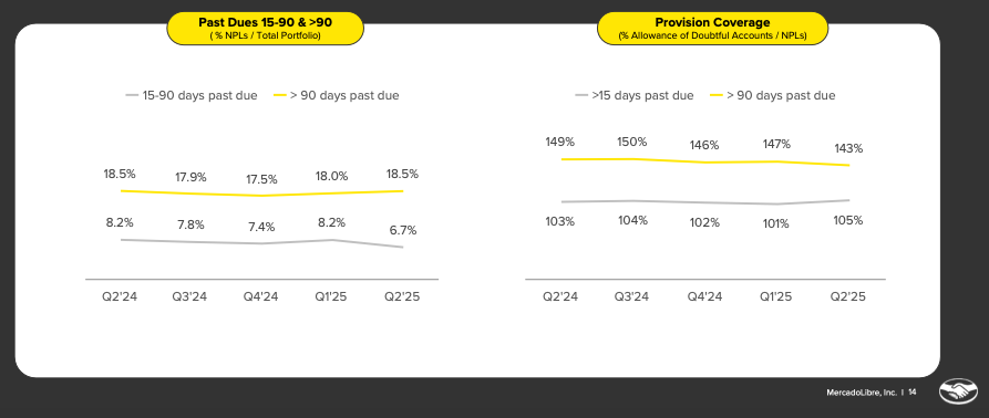 Credit quality also improved with the 15 to 90 day default rate falling to 6.7%, the lowest in 7 years. MELI attributed this to better asset quality and portfolio mix.