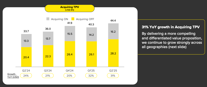 Mercado Pago’s total payment volume (TPV) rose 39% YoY in USD terms to $64.6B, with acquiring TPV (on and off platform payments) hitting $44.4B, up 31% YoY.