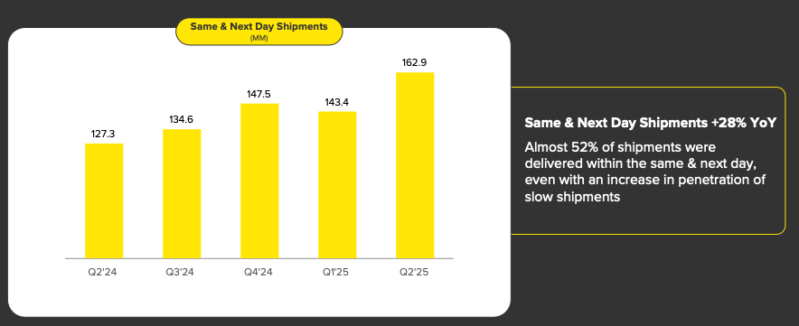 Same or next-day delivery rates increased by ~28% YoY, reinforcing its logistics moat. ~52% of shipments were delivered within the same or next-day despite an increase in penetration of slow shipments.