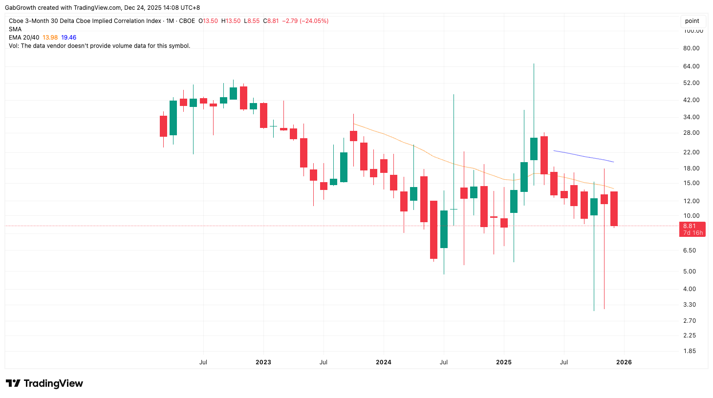 This indicates that the market expects S&P500 stocks, particularly the largest 50, to move more independently of each other over the next 3 months, rather than in lockstep. This creates dispersion in returns: some stocks can significantly outperform while others lag, even if the overall market is flat or up modestly.