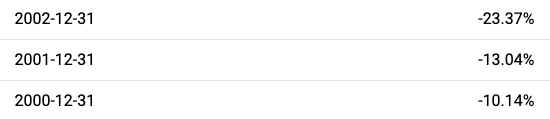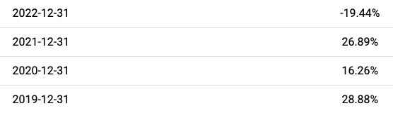 The last 3-year streak was from 2019-2021, followed by a -19.44% return in 2022.