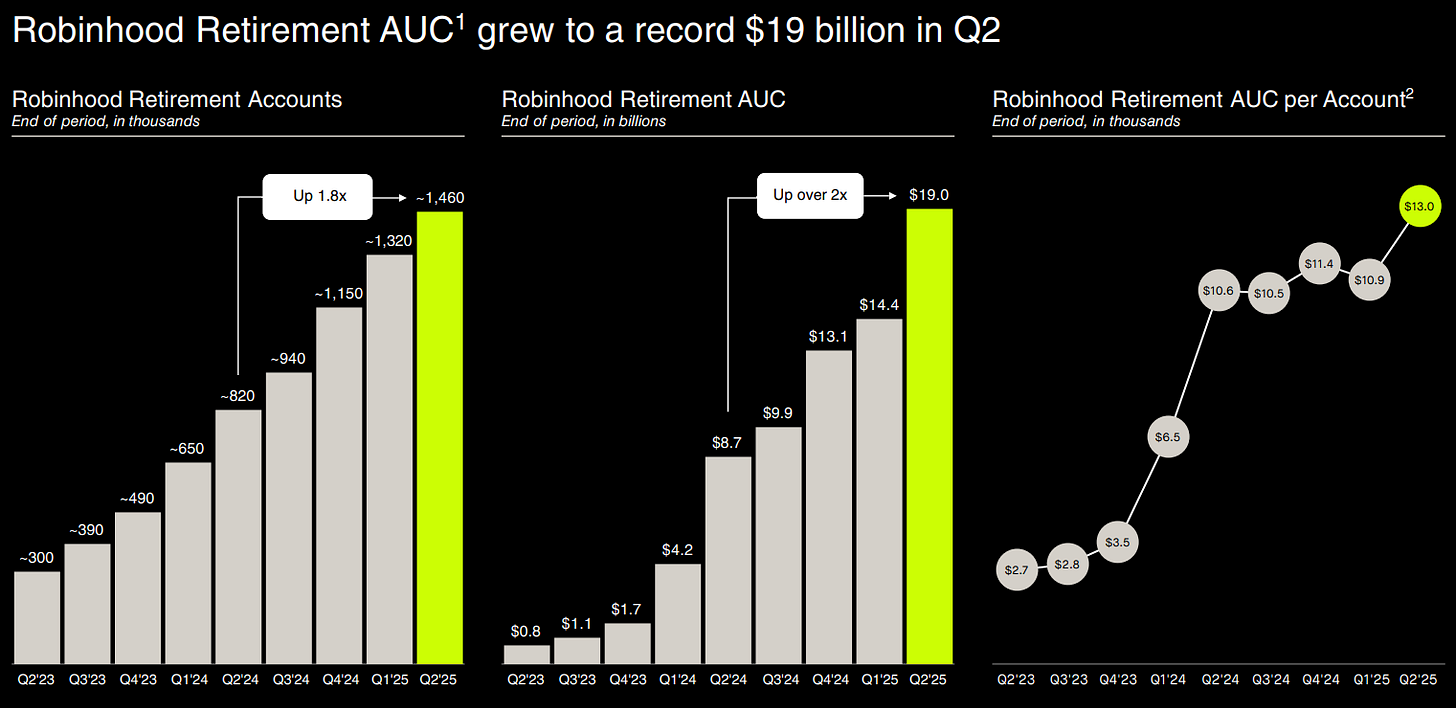 Retirement AUC is a key indicator that even the older, more wealthy individuals view Robinhood as a credible and trusted platform.