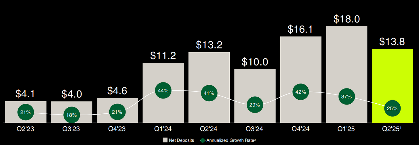 Robinhood appears to have gotten off to a great start in Q3 2025 with customers accelerating net deposits to ~$6B in July alone. This is roughly in line with Q1 2025’s results which was a record $18B.