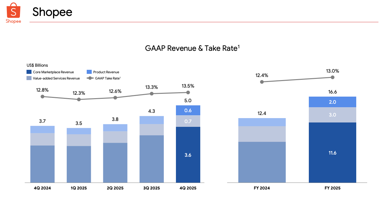Shopee’s GAAP take rate continued to climb, up to 13.5% this quarter. This brings FY2025 take rate to 13%, up 60bp from FY2024. Again, this was expected, as I predicted in last quarter’s review.