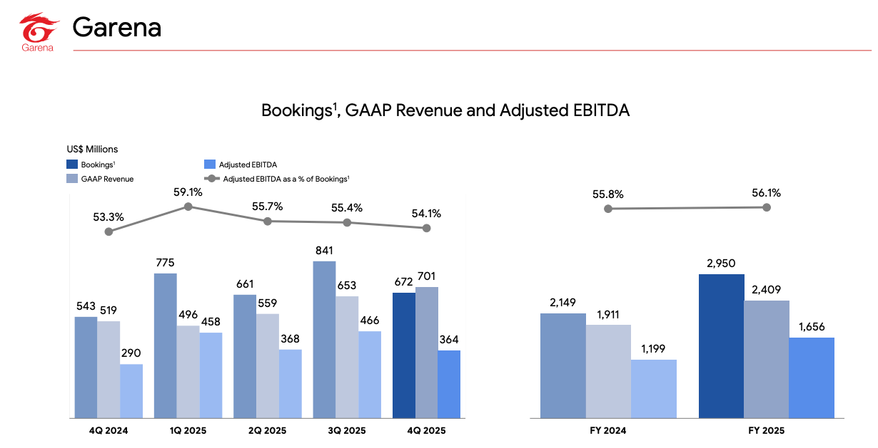 Garena had probably the weakest results of the 3 segments. Q3 2025 was certainly an anomaly in terms of bookings numbers. Bookings for that quarter came in at $841M, which was a massive increase over Q2. Q4 was more moderated, with a slight reversion to the mean as bookings came in at $672M. GAAP revenue hit a multi-year high of $701M.