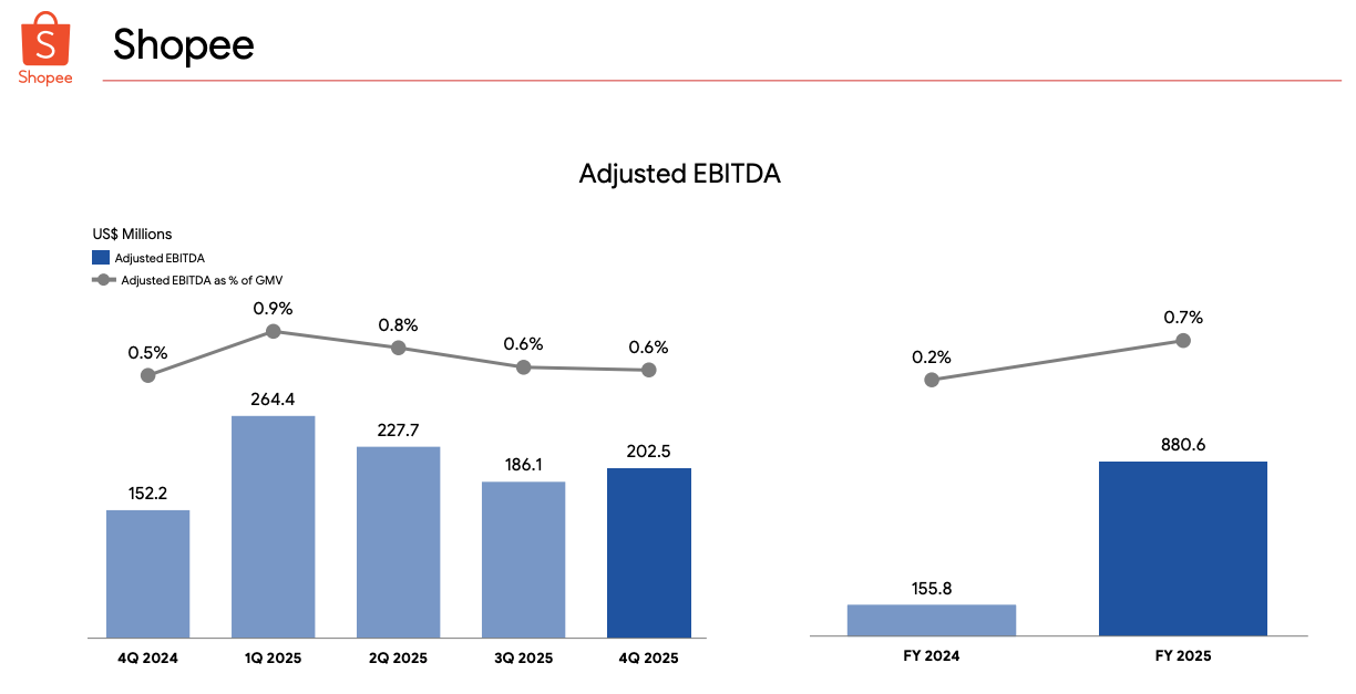 Of course, what concerned the market in particular in Q3 2025 was Adj. EBITDA margins for Shopee. This continued into Q4 2025, with 0.6% margins, compared to Q1 highs of 0.9%.