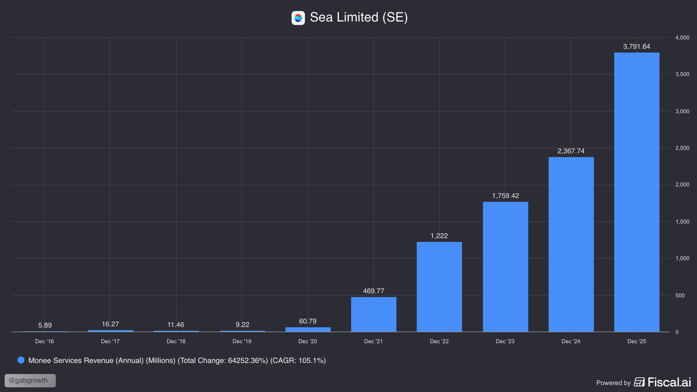 Since 2016, Monee has grown its revenues at a 105% CAGR, roughly doubling each year. Last year, it brought in $3.8B in revenues, with a 25.6% operating margin on a segment basis. This meant it accounted for nearly half of Sea’s entire EBIT for 2025.
