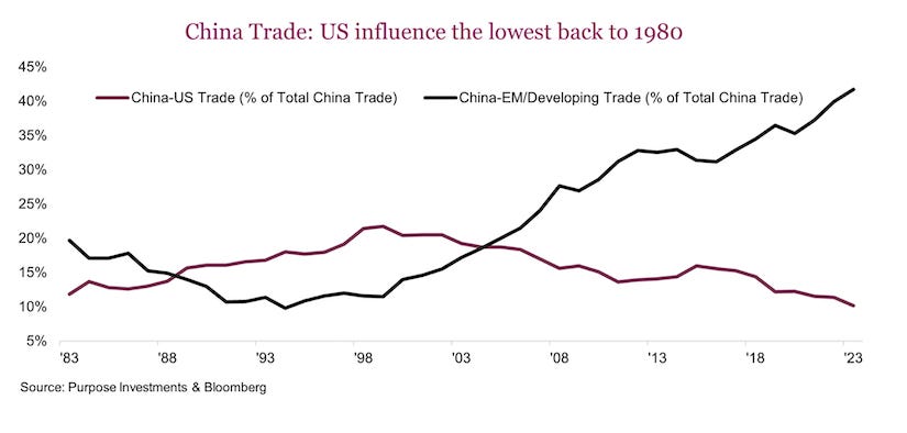 US influence on trade is also the lowest that it has ever been since the 1980s. China instead has soared ahead on influence and with the partnerships it has with EMs around the world, it could be argued that EMs stand to benefit most from this shift.