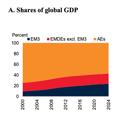 About 35% of global trade was attributable to EMDEs in 2023 vs. 20% in 2000, while EMDEs received about 20% of global capital inflows in 2019-2023 vs. 6% in 2000-2004.
