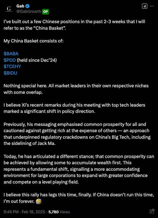 I believe 2025 will continue to be a strong year for Chinese equities, with the key thesis being mean reversion and an accommodating environment.